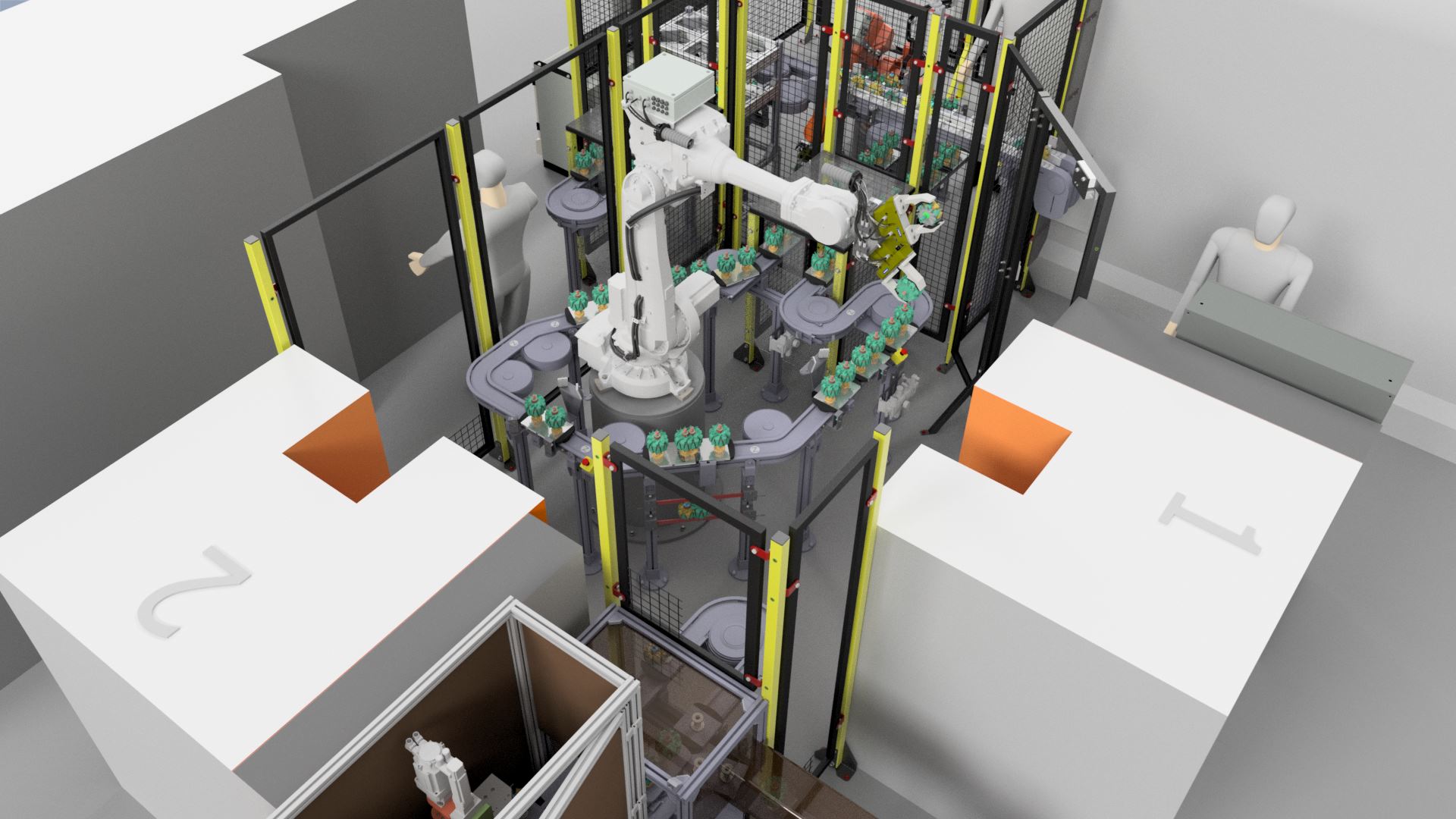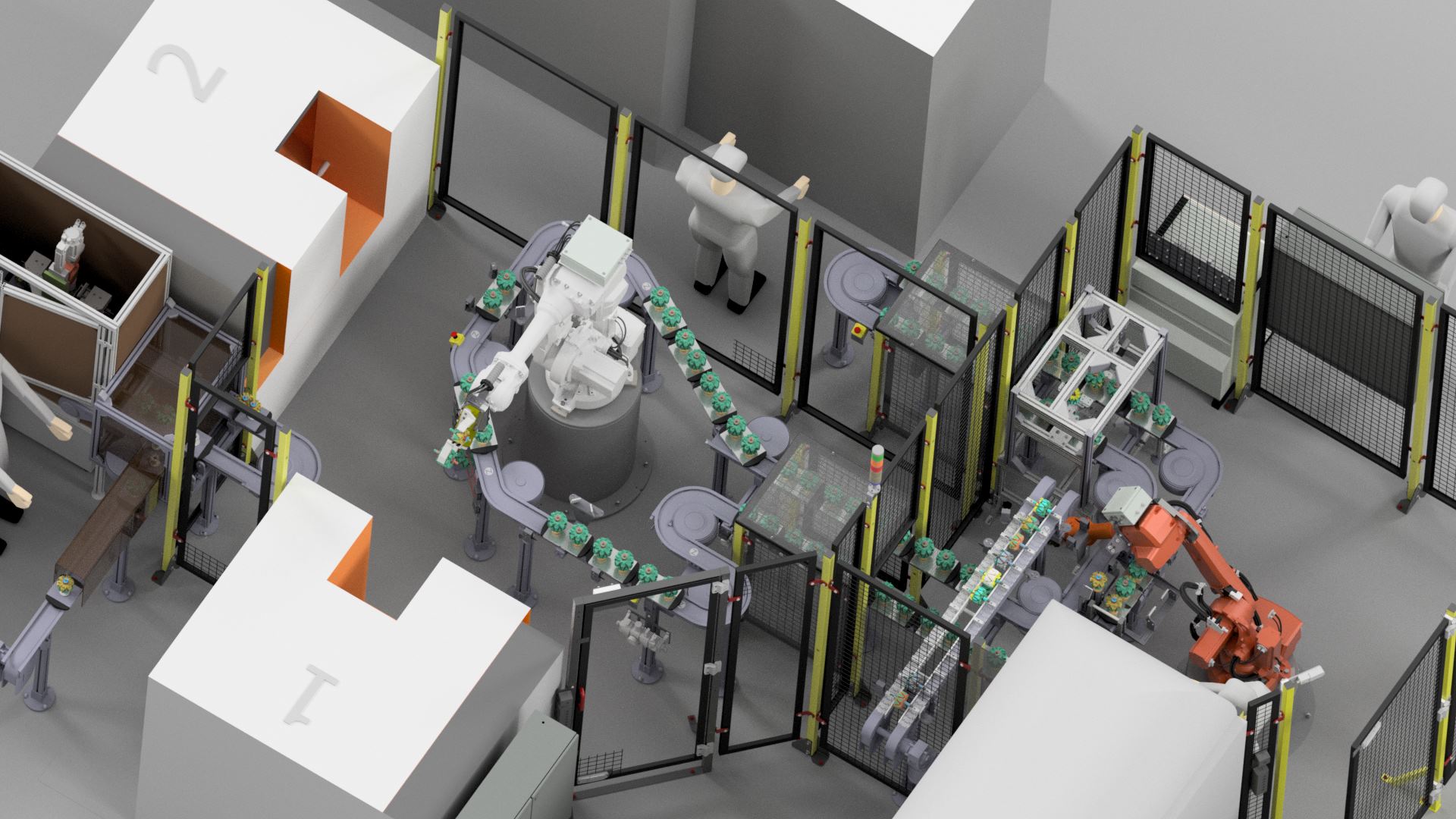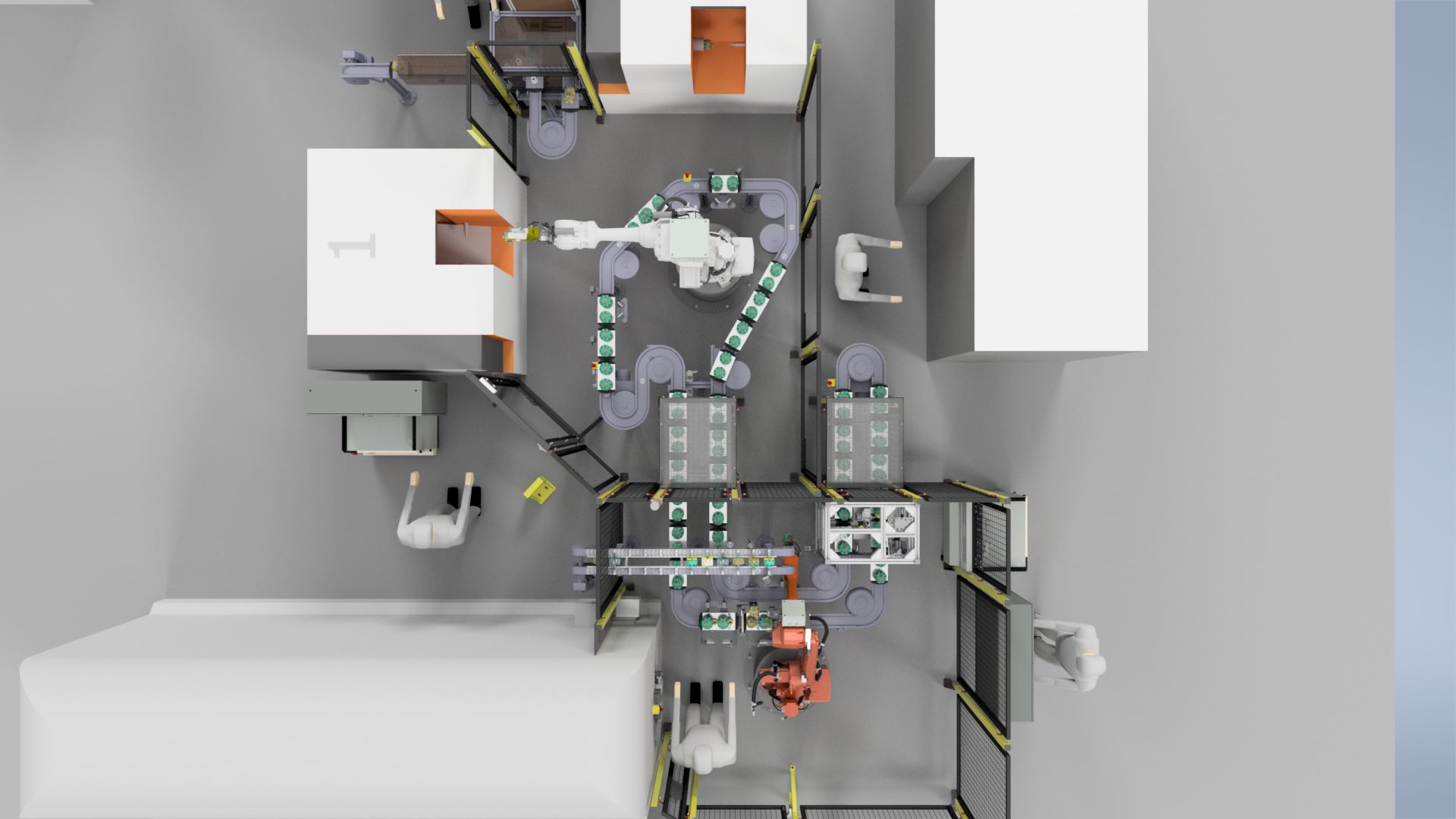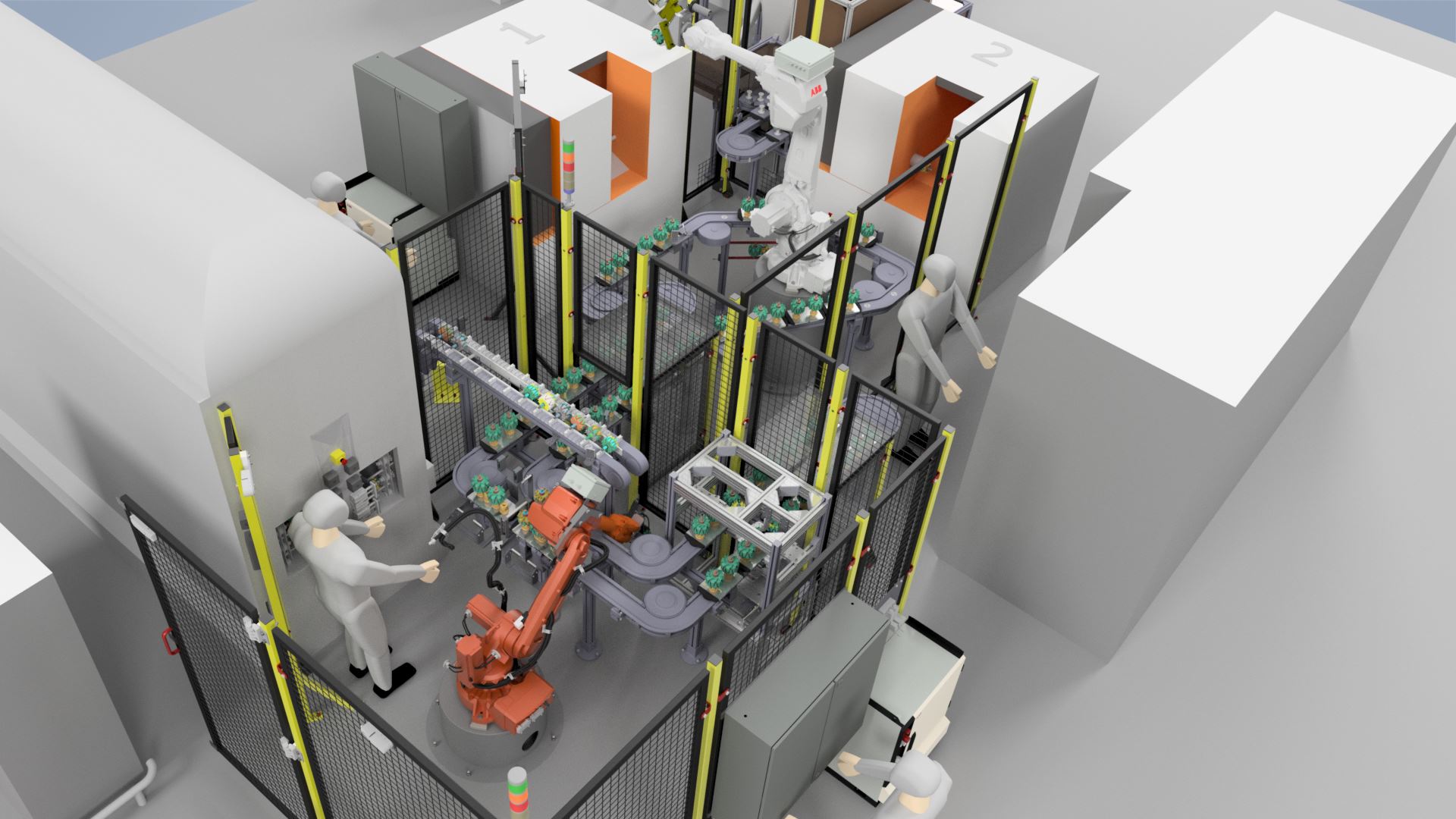 A már meglévő CNC gépekhez készült cella egy utólagos automatizálás, ami elrendezésével megtartotta a kézi üzem lehetőségét is, megfelelő biztonsági intézkedésekkel.