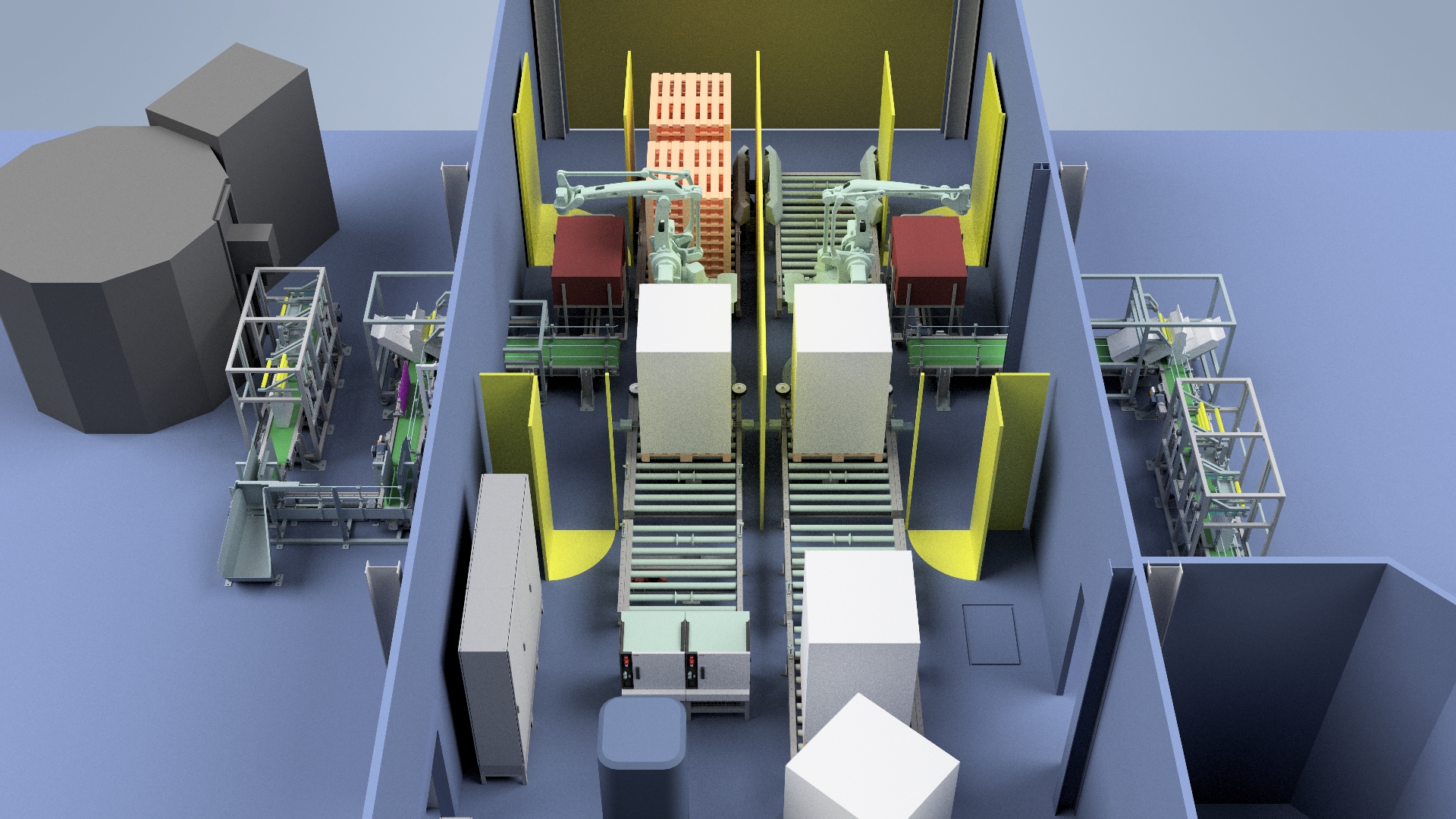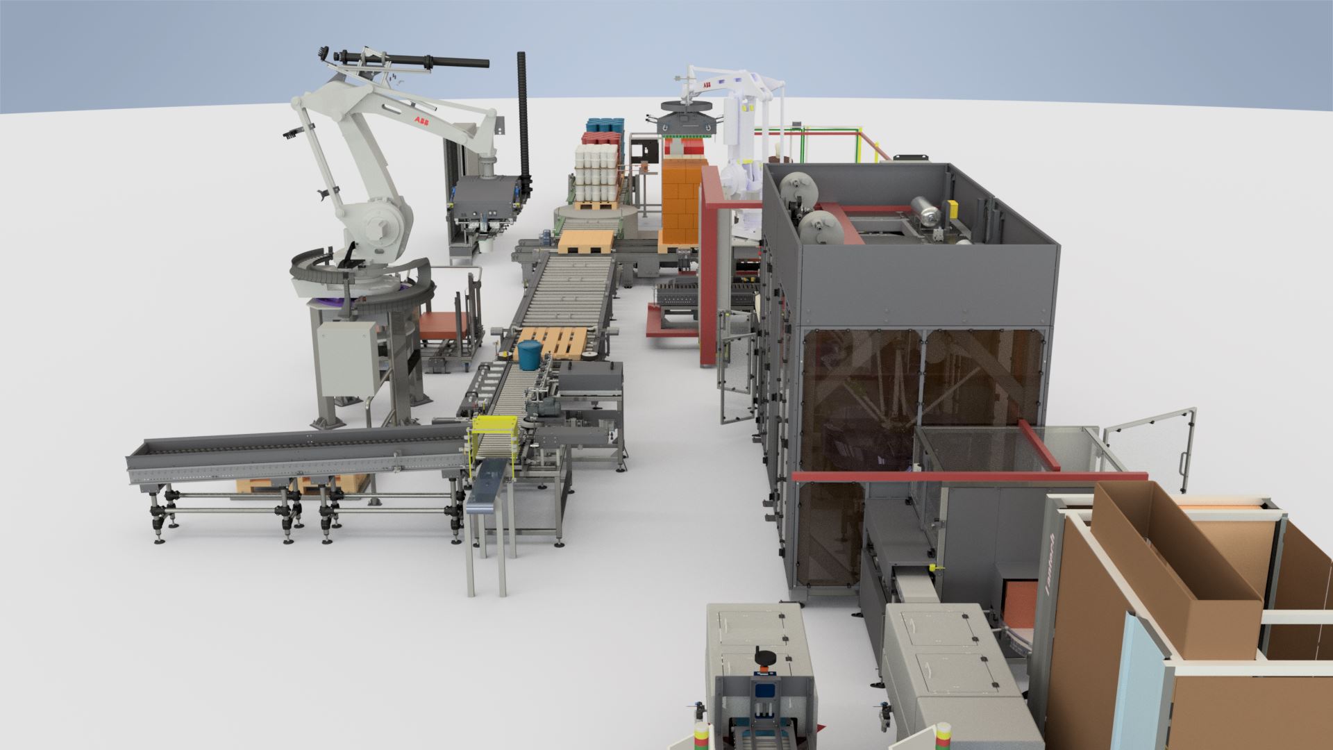 A rendszer a szerelősorokról érkező dobozokat összegyűjti egy főpályára majd elszállítja a raklapozó cellákhoz. Itt vonalkód alapján szétválogatja és a megfelelő raklapozási helyre továbbítja azokat. Ezeket a megfelelő receptúra alapján raklapozza, majd a teli raklapokat automatán fóliázza. A fóliázott raklapokra egy robotkar segítségével megfelelő számú címkét helyez fel, a kész raklapot ezután átadja a raktári rendszernek.